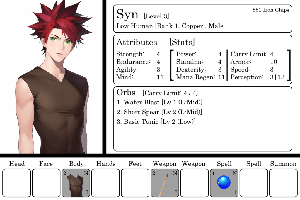 After beating him senseless, she would say, “You need a shield. Or at least a defensive spell.” Or, “Find a flying summon of some sort. It’ll be able to scout ahead, distract the enemy, or attack from a distance.” Or, “Find teammates that compliment your Orbs and skill. At least an attacker or tank. You’ve got a unique skill, but you’ll need someone to watch your back and deal damage.” “Oh, get shoes as as soon as possible. You’ll need to keep your Speed stat up without increasing Agility. That’ll be tough.”
