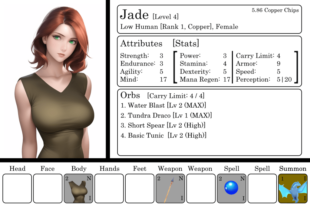 After buying the Orb, Jade upgraded all four Iron Orbs to Copper. After securing her ticket on the caravan and daily entry fee, Jade put most of her energy into gaining upgradeable materials. Luckily, she found most of them while out hunting and bought the rest before coming back to her Room. She sighed at the huge void in her wallet. Down to 5 Copper Chips. She shook her head, grinned, and looked at her Orbs.
